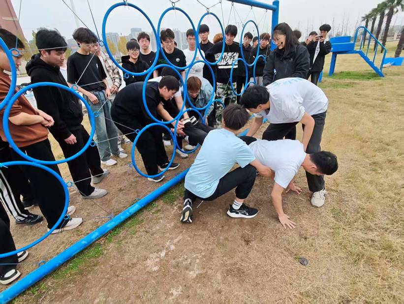 在仿真射击环节,指导老师详细讲解了持枪、瞄准等技术要点。学生们亲手操作模拟枪械,在射击体验中不仅感受到装备的重量与后坐力,更体会到军人所必备的专注与担当,实现了国防教育从“认知”到“感知”的深化;军事攀岩项目成为考验勇气与意志的实践课堂。学生们穿戴安全装备,迎难而上,在岩壁上不断寻找支撑点,突破体力与心理的极限。登顶的瞬间,不仅是个人的胜利,更是对军人顽强拼搏精神的真切体悟;“穿越电网”素质拓展项目则将团队协作推向高潮。面对模拟电网障碍,同学们迅速分工、默契配合,在无声环境中运用手势沟通,不断调整策略,协力完成挑战。整个过程充分展现了集体智慧与凝聚力,也让每位参与者深刻认识到国防建设中团结协作的重要性。