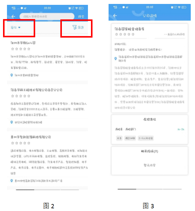 点击"前往报名”,进入岗位筛选界面,如图2,左上角“省份”可筛选实习岗位地址,其中显示所有岗位所在省份,右上角“筛选”可详细筛选专业、待遇等条件。