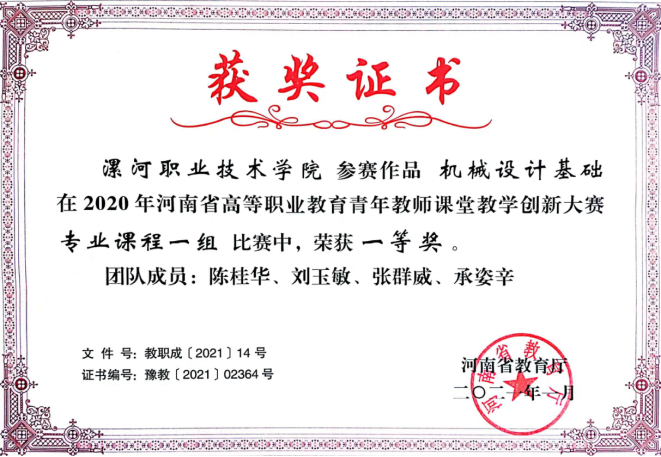 2019年,团队教师在河南省青年教师课堂教学创新大赛中获得一等奖。