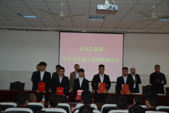 在表彰会上,校学工部部长、学生处处长程传蕊讲话。她对机电工程系开展“红色文化育人”活动的做法予以积极评价,对今后的工作提出要求。她指出,机电工程系开展“红色文化育人”活动,紧扣思政教育主题,主题新颖、形式多样、内容丰富、效果明显,已经逐渐成为我校思政工作和学生工作的一道亮丽的风景线。机电工程系开展“红色文化育人”活动的成功经验主要有两点:一是政治站位高,思想性强,紧扣思政工作的时代主题;二是“红色文化育人”活动的着力点很准,活动开展扎实有效。程传蕊对今后开展活动提出希望和要求:一是扎实开展好红色育人活动,为我校思政工作探索新模式、开辟新途径。二是紧密结合开展“不忘初心、牢记使命”主题教育,传承红色基因。三是认真总结和提炼,力争把这一活动打造成学生思政教育工作品牌。